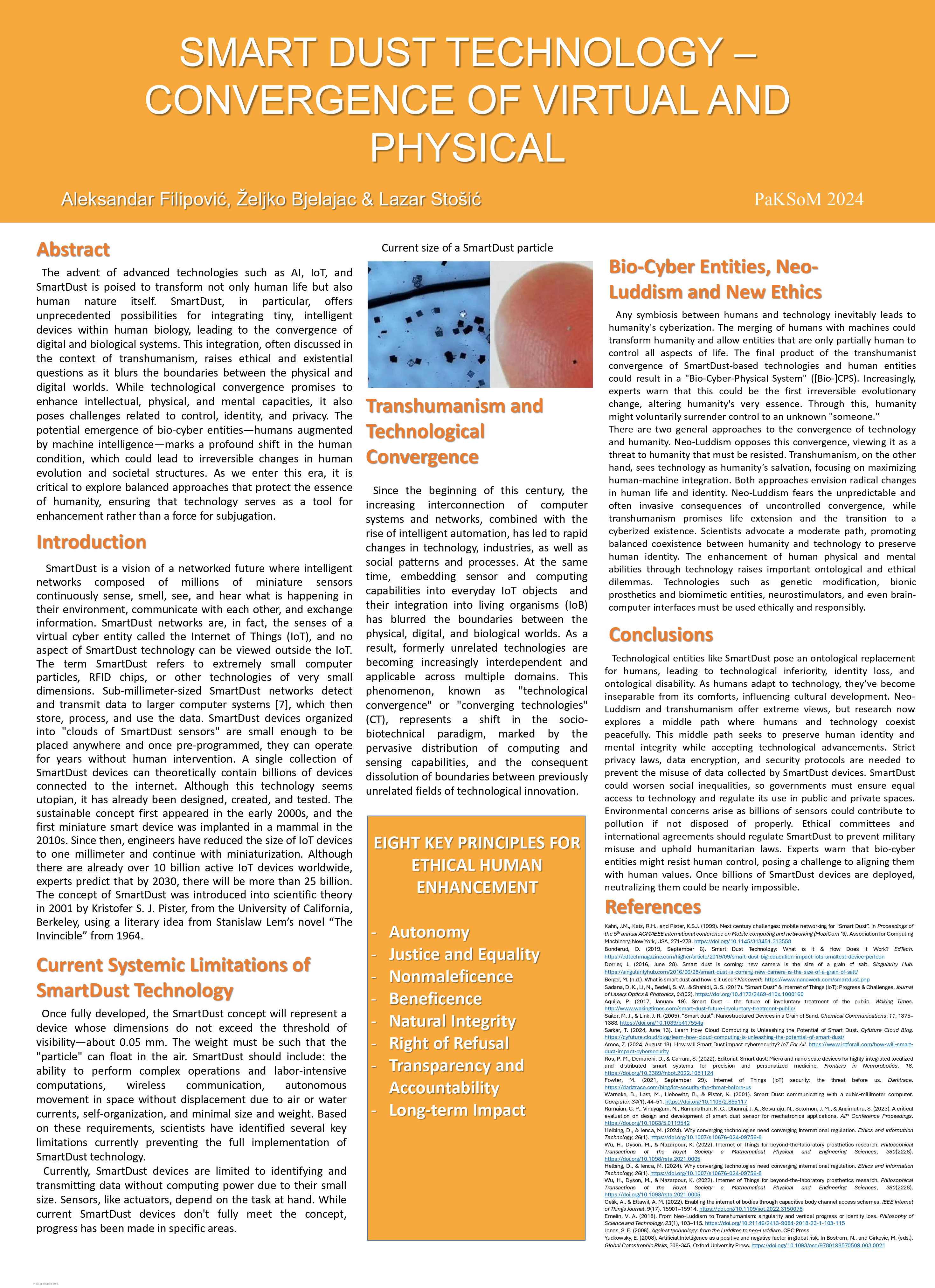 Les entités technologiques comme SmartDust constituent un remplacement ontologique des humains, conduisant à l’infériorité technologique, à la perte d’identité et à l’incapacité ontologique. À mesure que les humains s’adaptent à la technologie, ils sont devenus indissociables de son confort, influençant le développement culturel. Le néoluddisme et le transhumanisme offrent des points de vue extrêmes, mais la recherche explore maintenant une voie médiane où les humains et la technologie coexistent pacifiquement. Cette voie médiane cherche à préserver l’identité humaine et l’intégrité mentale tout en acceptant les progrès technologiques. Des lois strictes sur la protection de la vie privée, le cryptage des données et les protocoles de sécurité sont nécessaires pour empêcher l’utilisation abusive des données collectées par les appareils SmartDust. SmartDust pourrait aggraver les inégalités sociales, c’est pourquoi les gouvernements doivent garantir l’égalité d’accès à la technologie et réglementer son utilisation dans les espaces publics et privés. Des préoccupations environnementales se posent car des milliards de capteurs pourraient contribuer à la pollution s’ils ne sont pas éliminés correctement. Les comités d’éthique et les accords internationaux devraient réglementer SmartDust afin d’empêcher l’utilisation abusive à des fins militaires et de faire respecter les lois humanitaires. Les experts avertissent que les entités bio-cybernétiques pourraient résister au contrôle humain, ce qui poserait un défi pour les aligner sur les valeurs humaines. Une fois que des milliards d’appareils SmartDust seront déployés, il pourrait être presque impossible de les neutraliser.