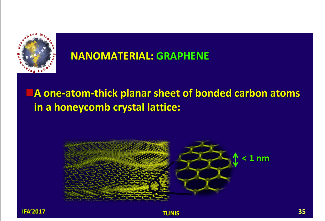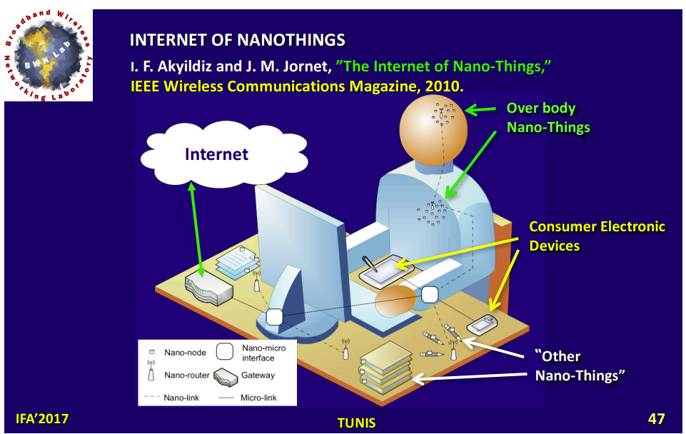 La convergence technologique décrite par Akyildiz, "Internet of Nanothings 2017" étend l'Internet des Objets (IoT) à des échelles beaucoup plus petites. Elle inclut l'Internet des Nano-Objets (IoNT) et l'Internet des Bio-Nano-Objets (IoBNT). L'IoT classique connecte divers objets comme des capteurs, téléphones ou appareils électroménagers via Internet. L'IoNT intègre la nanotechnologie pour créer de minuscules nano-objets capables de détecter, traiter et communiquer des informations. Ces nano-objets utilisent des composants comme des nano-antennes et nano-émetteurs récepteurs, potentiellement à base de graphène, et peuvent communiquer dans la bande Terahertz. L'IoBNT se concentre sur l'interconnexion de machines biologiques à l'échelle nanométrique, telles que des cellules ou des bactéries, pour former des réseaux. La communication dans l'IoBNT utilise souvent la communication moléculaire, où l'information est encodée dans des molécules. L'objectif est de connecter ces réseaux bio-nanométriques hétérogènes à l'Internet, nécessitant parfois des interfaces bio-cyber pour traduire les signaux. Cette convergence permet une interaction sans précédent entre les mondes physique, biologique et l'information numérique. Enfin, l'étude est une validation scientifique importante des capacités du graphène pour la nano-communication, ce qui est un argument solide pour son statut de matériau clé dans ce domaine précis de recherche et développement futur.