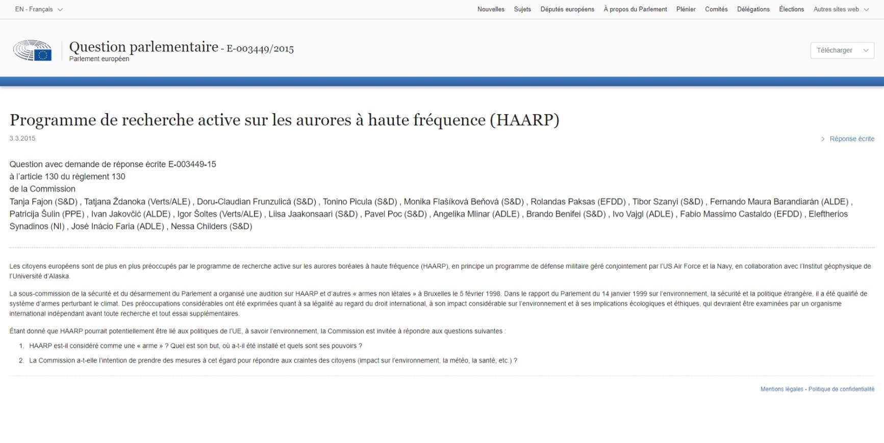 2 : « HAARP peut servir à créer des lentilles à plasma dans l’atmosphère, ce qui ouvre la possibilité d’armes à énergie dirigée... puissent utiliser le miroir ainsi créé pour atteindre instantanément une cible au sol, en vol ou dans l’espace, partout dans le monde, et avec une puissance telle que la cible est immédiatement vaporisée. »