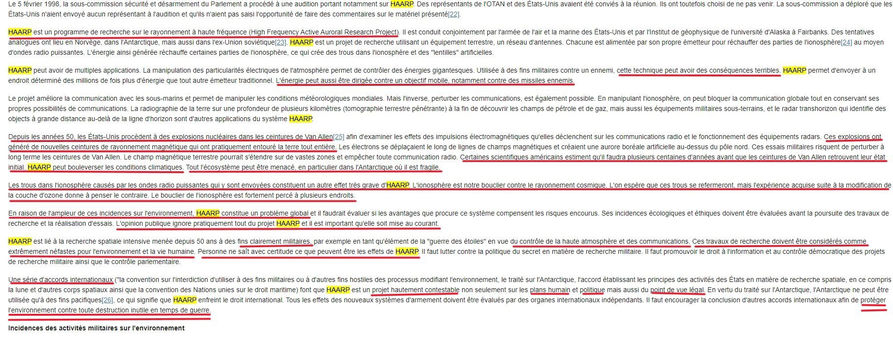 1 : En 1975, le sénateur démocrate américain Gaylord Nelson (décédé en 2005) a obligé la Marine nationale à publier le résultat des recherches qui prouvent bien que ces basses fréquences risquent de modifier la chimie du sang chez l’être humain et de changer ses états émotionnels, comme on le fait avec la psychotronique.« En fait, l’objectif réel de HAARP semble être de "pouvoir atteindre et bombarder à volonté n’importe quel point de la Terre et de l’espace proche avec un faisceau d’énergie directif ultra-puissant, sans utiliser de satellite" ! »