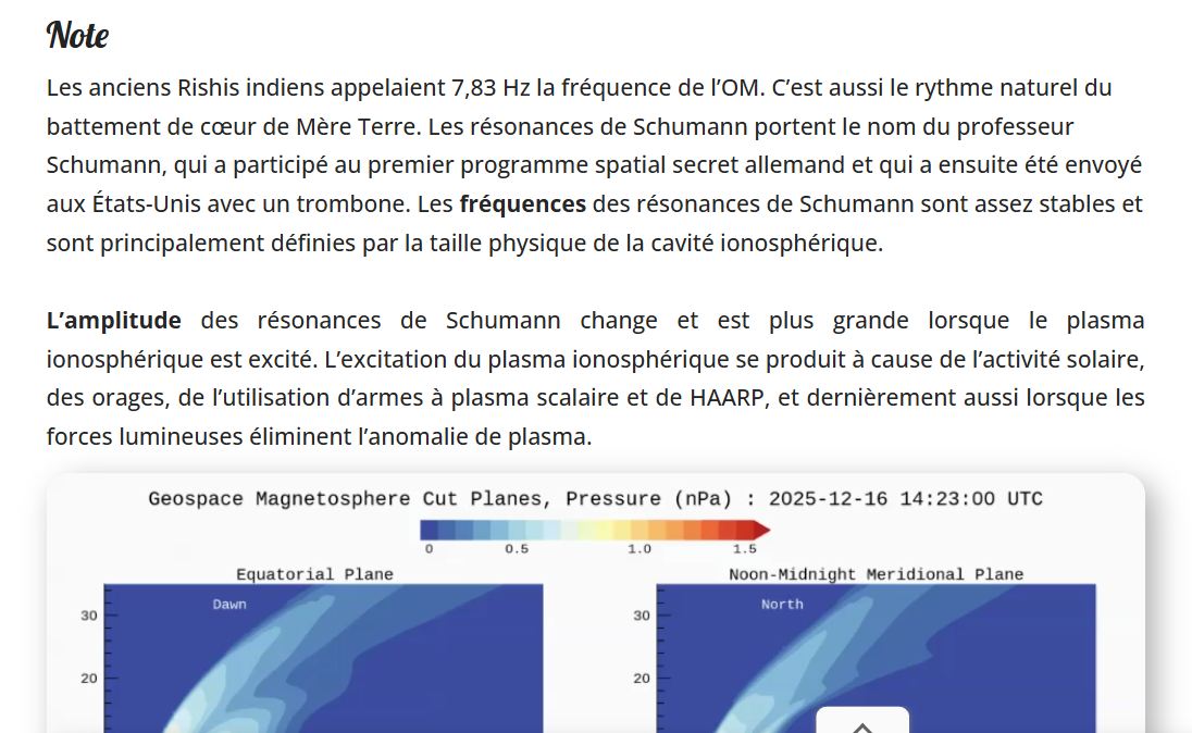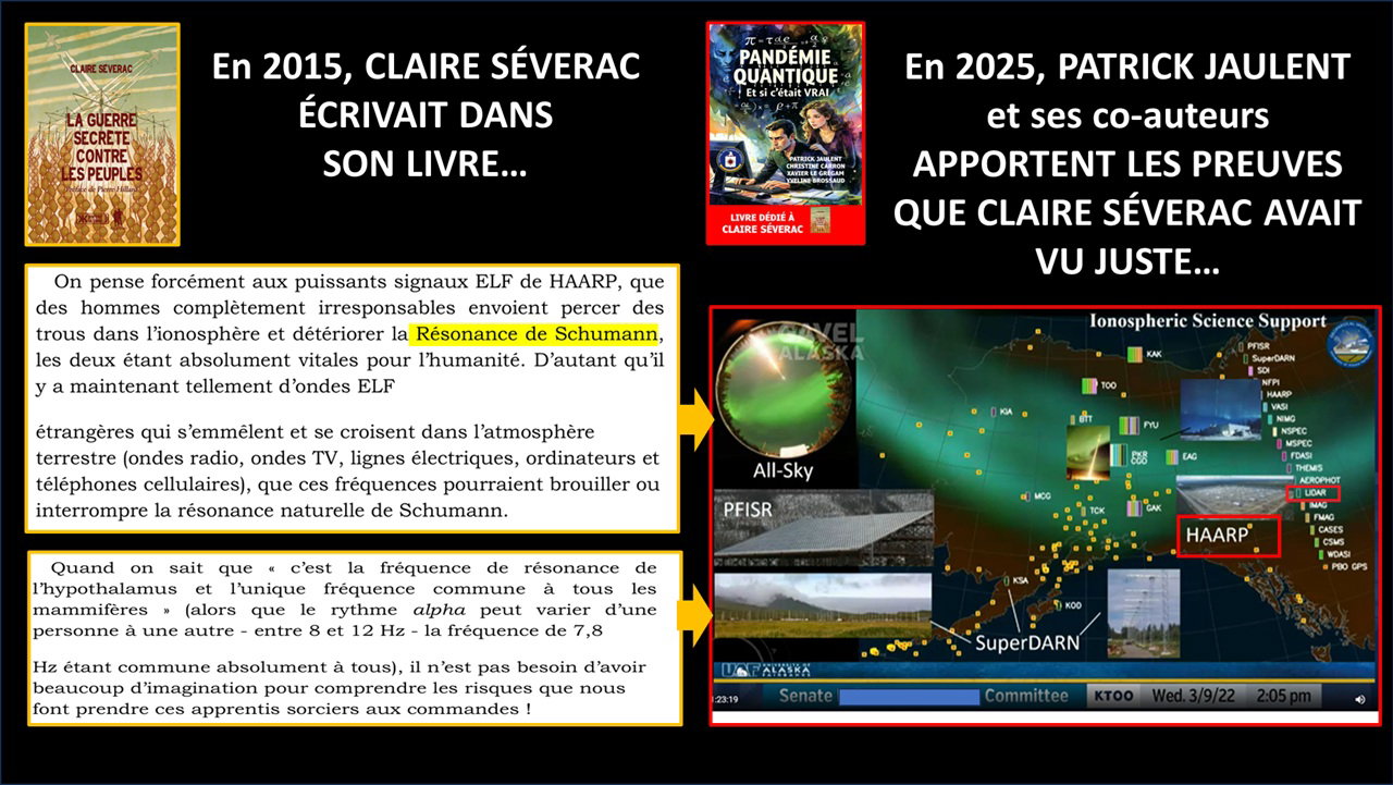 « On pense forcément aux puissants signaux ELF de HAARP, que des hommes complètement irresponsables envoient percer des trous dans l’ionosphère et détériorer la Résonance de Schumann…» Claire Séverac.