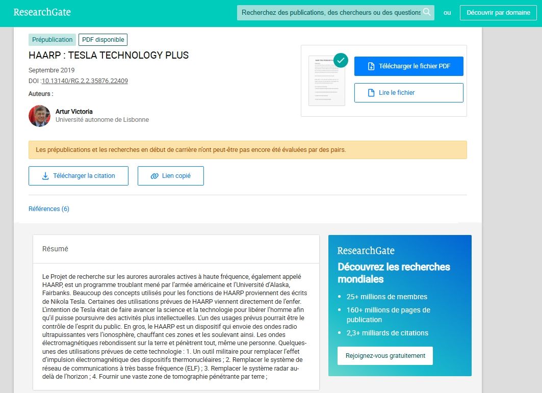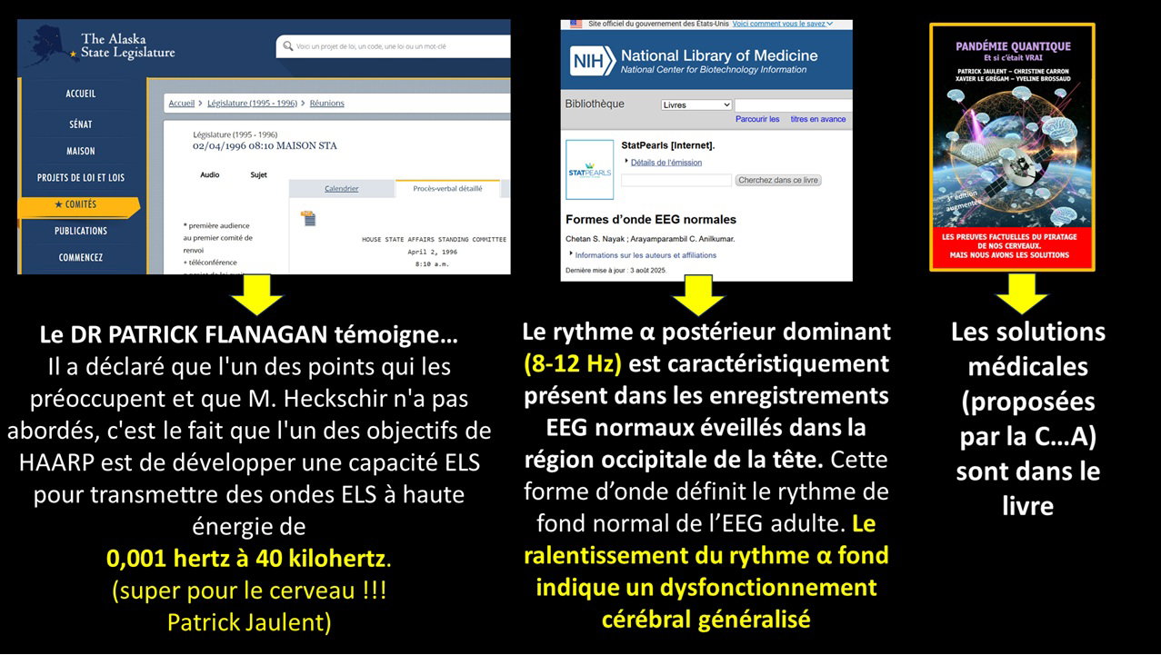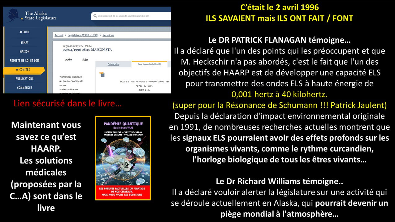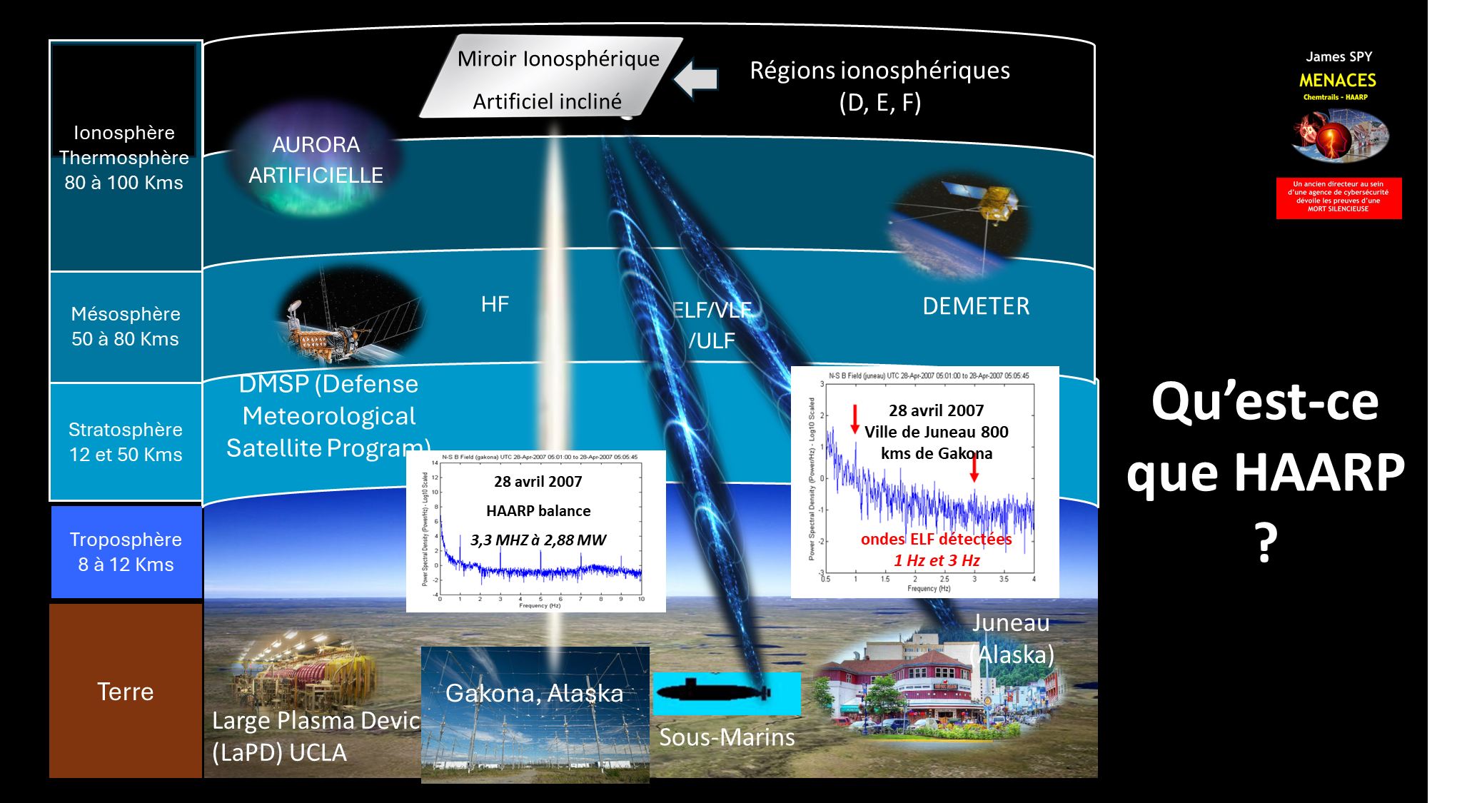 Dans ce livre, il y les preuves factuelles de « L’utilisation de l’ionosphère comme milieu actif et non linéaire permettant de transformer l’énergie primaire HF de manière contrôlée en rayonnement cohérent de 0,001 Hz à 40 kHz, puis en longueurs d’onde infrarouges et visibles incohérentes. »