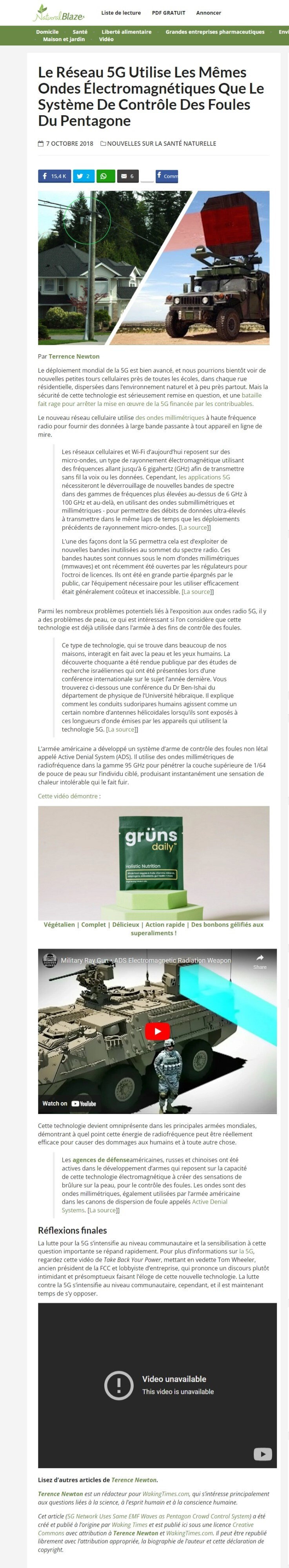 9 : « liste de ces armes, dont les tasers, matraques à électrochocs ou gaz incapacitants, des "inhibiteurs neuronaux qui frappent les personnes d’incapacité, paralysant les connexions synaptiques" ; ... "impulsions micro-ondes puissantes" (HPM High Power Microwave) qui "induisent confusion, stupeur et coma chez les personnes et les animaux". »